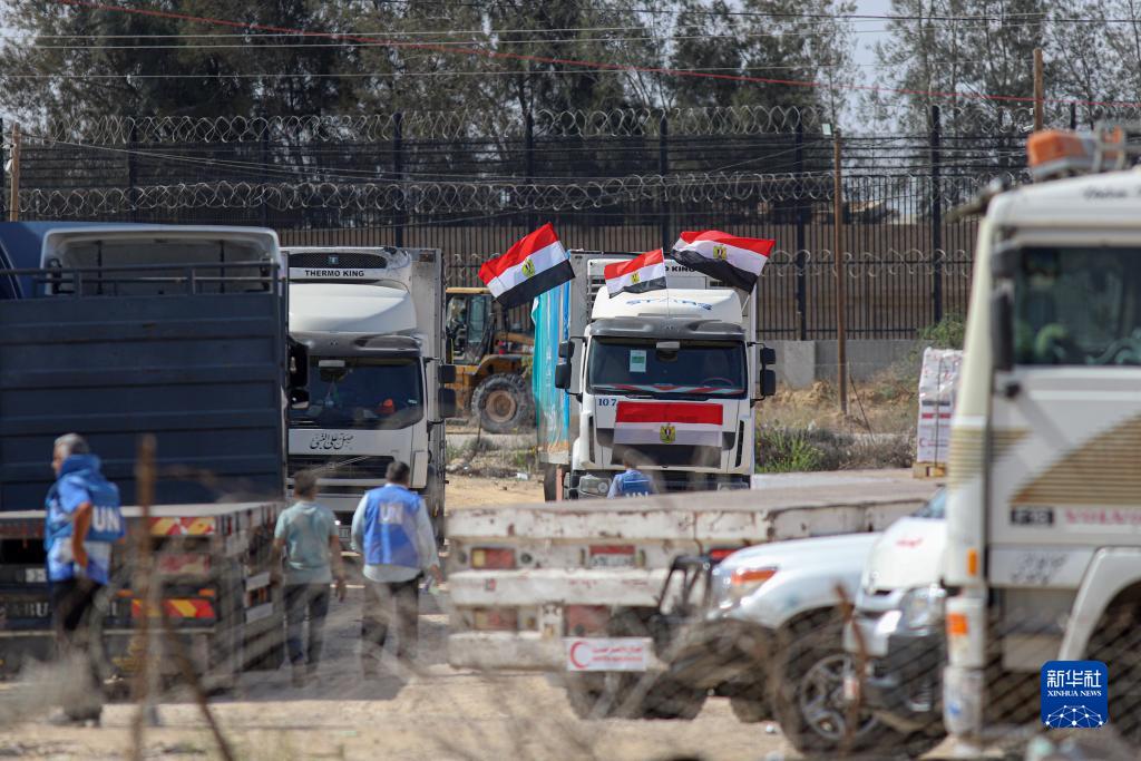 10月21日,裝載有人道援助物資的貨車(chē)通過(guò)拉法口岸進(jìn)入加沙地帶。