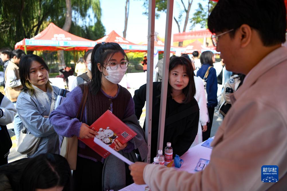 10月21日,高校學(xué)生(左二)在招聘會(huì )現場(chǎng)與用人單位工作人員交流,投遞簡(jiǎn)歷。