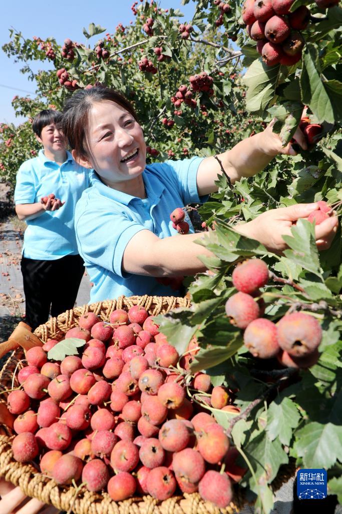 10月21日,農民在山東省東營(yíng)市東營(yíng)區現代高效農業(yè)產(chǎn)業(yè)園藍海逸園生態(tài)基地采收山楂。