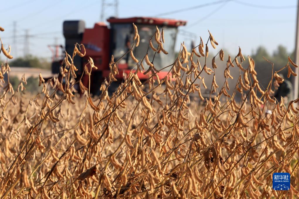 10月21日,在河北省石家莊市藁城區南營(yíng)鎮順中村大豆田里,農民駕駛農機收割大豆。