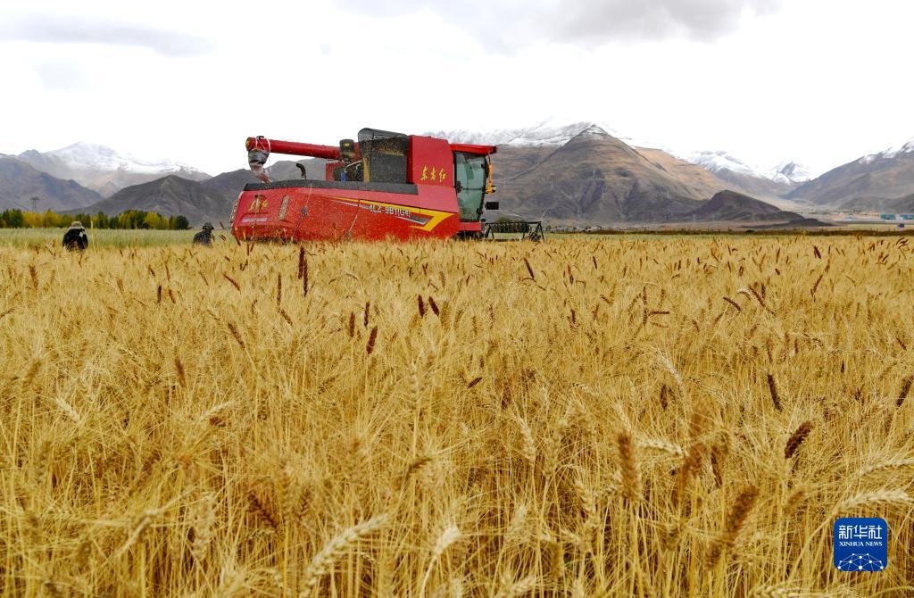 工作人員駕駛農業(yè)機械在西藏拉薩市林周縣曲果強村的高標準農田里收獲小麥(10月12日攝)。