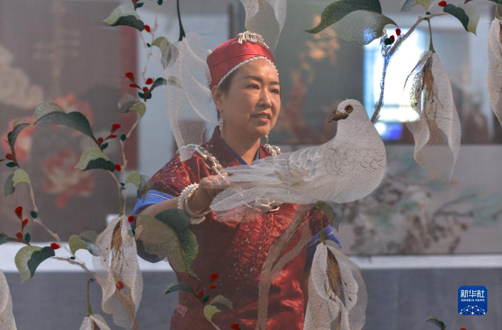 龍祿穎在公司的苗繡產(chǎn)品數字化云生產(chǎn)車(chē)間查看刺繡室內裝飾畫(huà)成品(10月18日攝)。