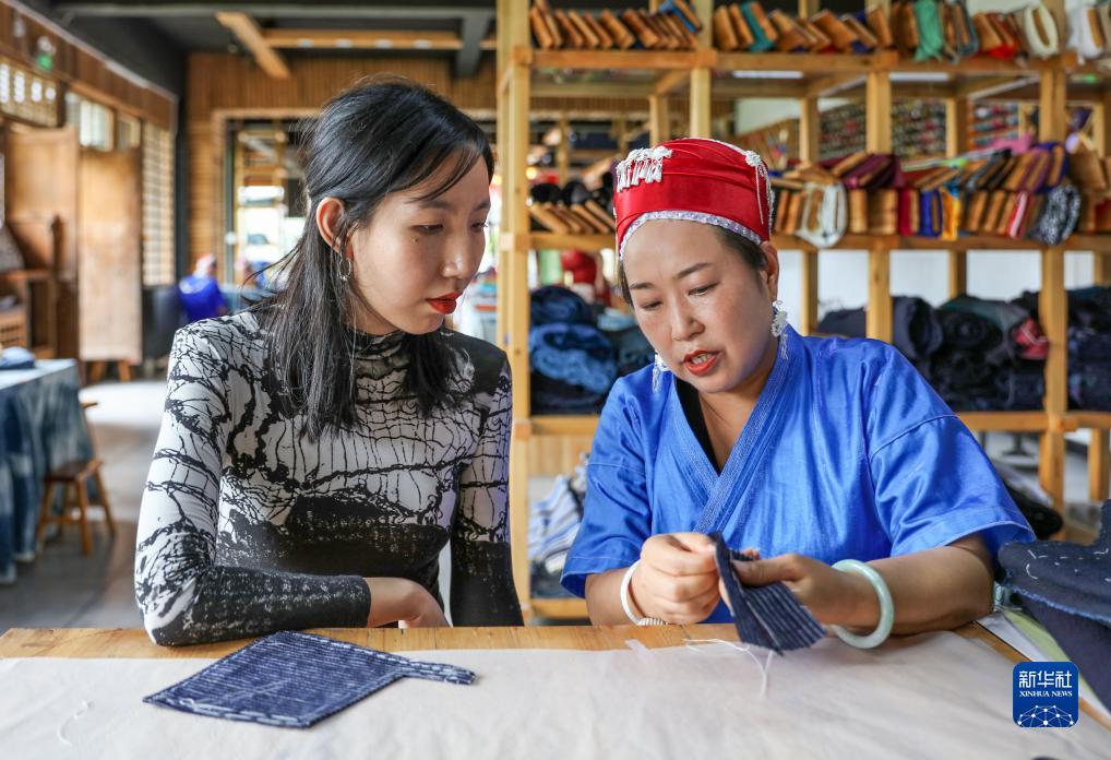 在舞水云臺旅游商品開(kāi)發(fā)有限公司設計室,龍祿穎(右)與留美歸國設計師王雨楠研發(fā)新苗繡產(chǎn)品(2022年6月28日攝) 。