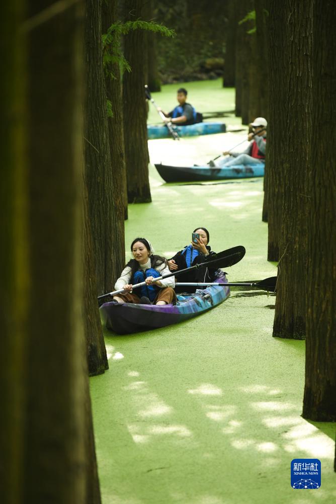 金秋時(shí)節,浙江杭州臨安青山湖近百畝池杉和落羽杉混交林呈現“抹茶森林”景觀(guān),引得大批游客前來(lái)泛舟、漫步觀(guān)光。這片浸沒(méi)于水中的森林每到秋季就會(huì )鋪滿(mǎn)浮萍,浪漫景觀(guān)宛如“綠野仙蹤”。