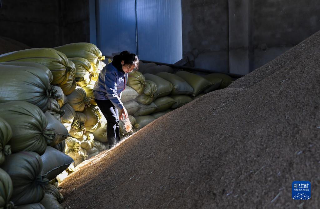 10月20日,劉春艷在自己農場(chǎng)的糧倉內查看水稻稻谷。
