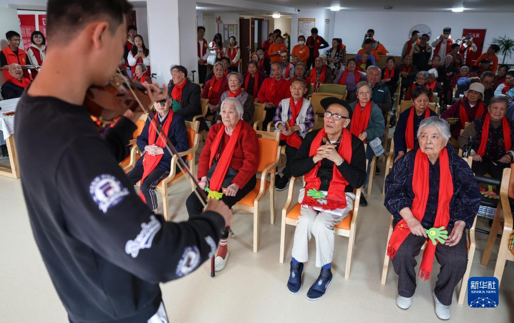 10月22日,在金煦福武侯萬(wàn)壽頤養中心,一名西南交通大學(xué)數學(xué)學(xué)院青年志愿者在給老人們表演小提琴。