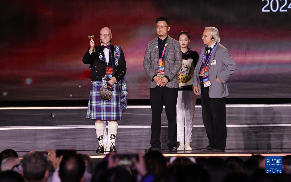 10月22日晚,在第81屆世界科幻大會(huì )閉幕式上,2023成都世界科幻大會(huì )聯(lián)合主席陳石(前中)將世界科幻大會(huì )“法槌”交與2024格拉斯哥世界科幻大會(huì )代表文森特·多切蒂(前左)。