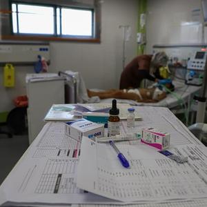 10月22日,在加沙地帶南部城市汗尤尼斯的納賽爾醫院,醫務(wù)人員救治在以色列空襲中受傷的兒童。