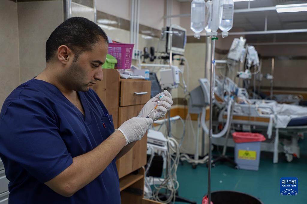 10月22日,在加沙地帶南部城市汗尤尼斯的納賽爾醫院,醫務(wù)人員救治在以色列空襲中受傷的巴勒斯坦人。