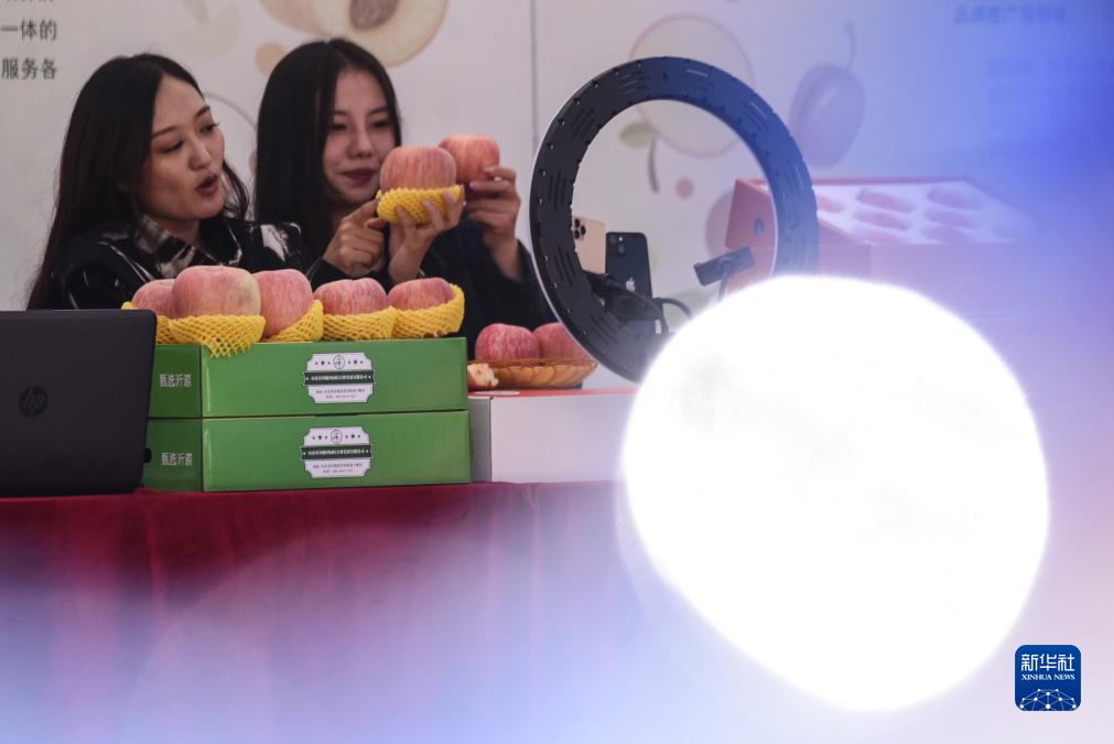 10月22日,工作人員在山東沂源蘋(píng)果節電商銷(xiāo)售大賽上直播帶貨。
