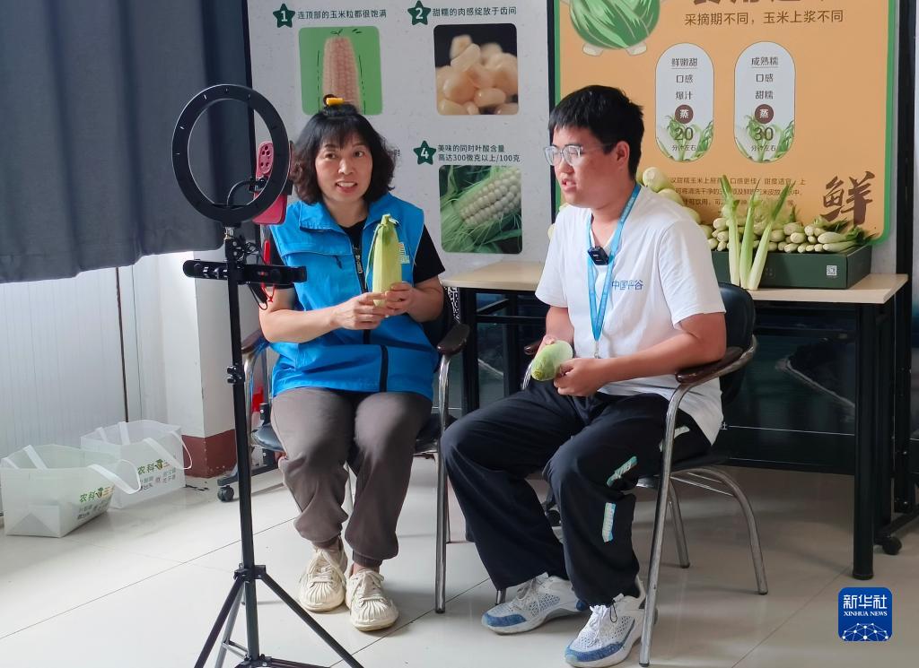 王翠云(左)與暑期社會(huì )實(shí)踐大學(xué)生一起在北臺頭村村委會(huì )通過(guò)視頻直播銷(xiāo)售玉米(8月3日攝,手機照片)。