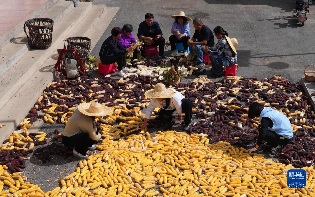 在北京市平谷區北臺頭村村委會(huì ),王翠云(后右三)與村民一起剝玉米(10月4日攝)。