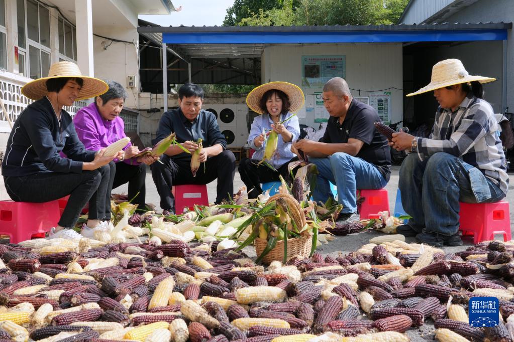 在北京市平谷區北臺頭村村委會(huì ),王翠云(右三)與村民一起剝玉米(10月4日攝)。