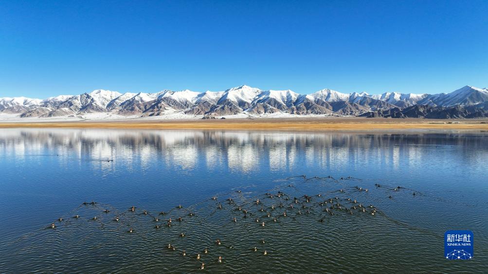 10月18日,在阿爾金山國家級自然保護區,針尾鴨等水鳥(niǎo)在依協(xié)克帕提湖棲息(無(wú)人機照片)。