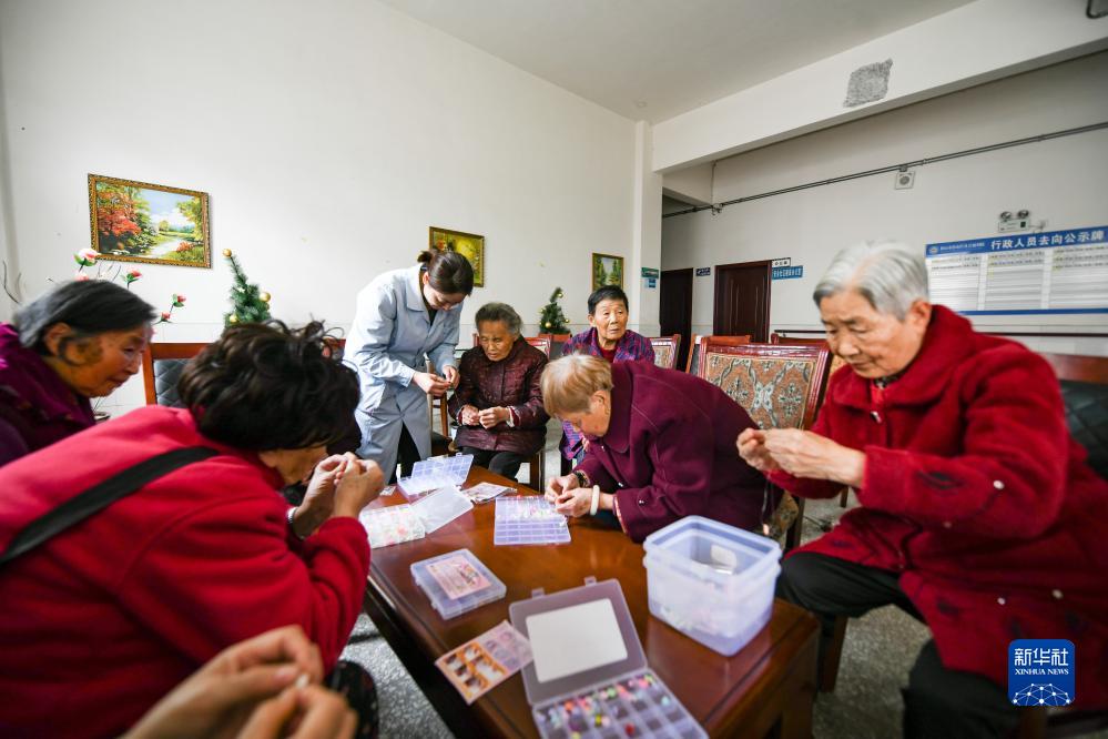 10月20日,在四川省眉山市彭山區社會(huì )福利院,趙鳳章老奶奶(右四)和福利院其他老人一起學(xué)做手工。