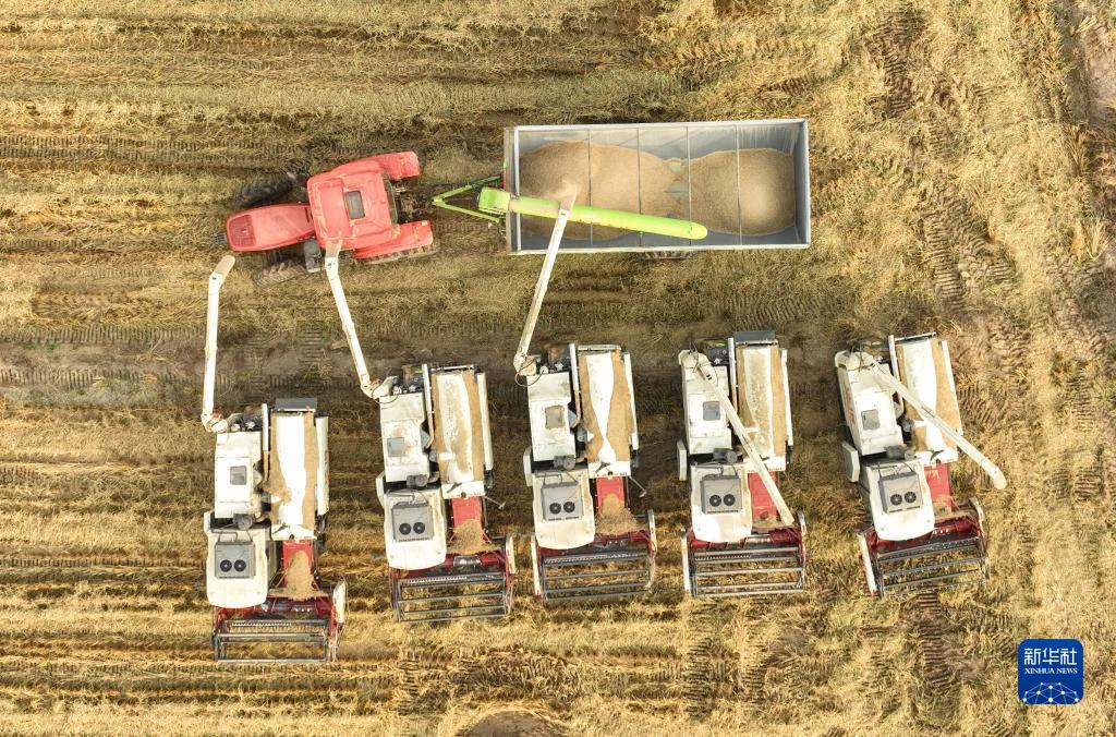 10月23日,水稻收割機在彰武縣大冷鎮上三家子村的稻田中將水稻裝車(chē)(無(wú)人機照片)。