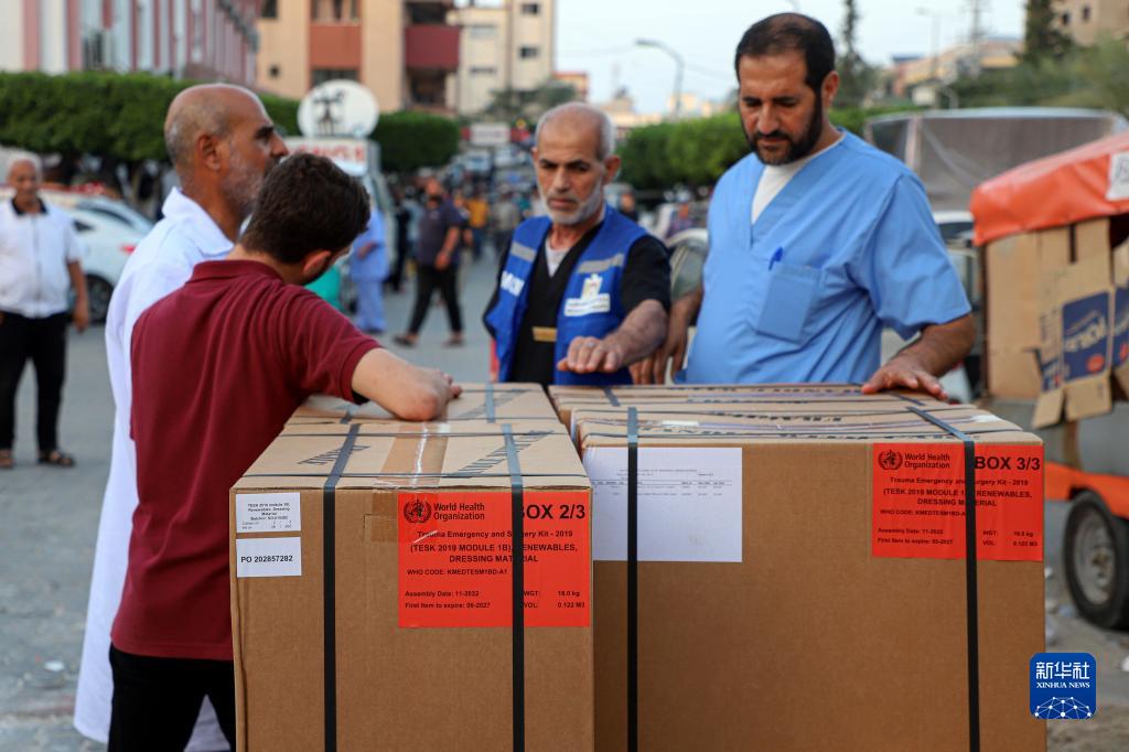 10月23日,在加沙地帶南部城市汗尤尼斯,醫院工作人員和聯(lián)合國近東巴勒斯坦難民救濟和工程處(近東救濟工程處)工作人員準備轉運救援物資。