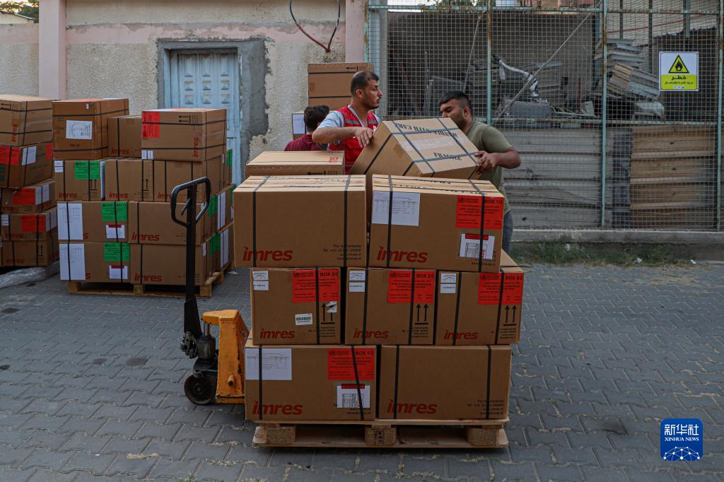 10月23日,在加沙地帶南部城市汗尤尼斯,工作人員搬運救援物資。