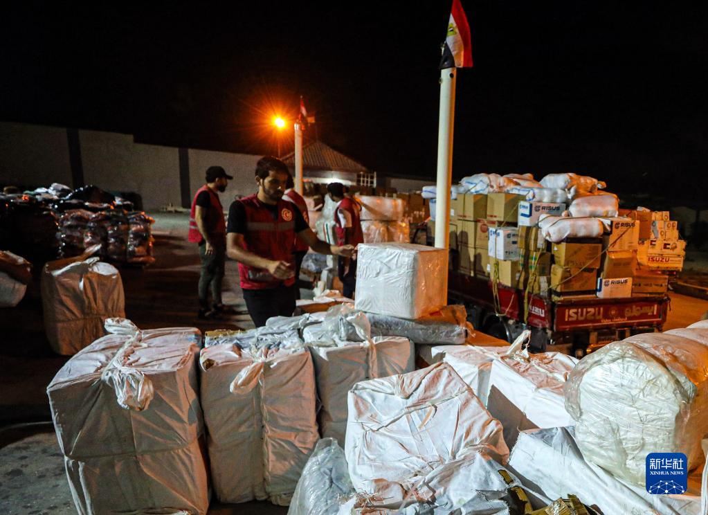 10月23日,在埃及阿里什市一處倉庫,埃及紅新月會(huì )的工作人員搬運救援物資。