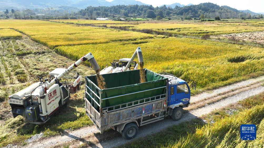 10月23日,在江西省分宜縣高嵐鄉千畝優(yōu)質(zhì)稻示范基地,收割機將收獲的稻谷裝入卡車(chē)(無(wú)人機照片)。