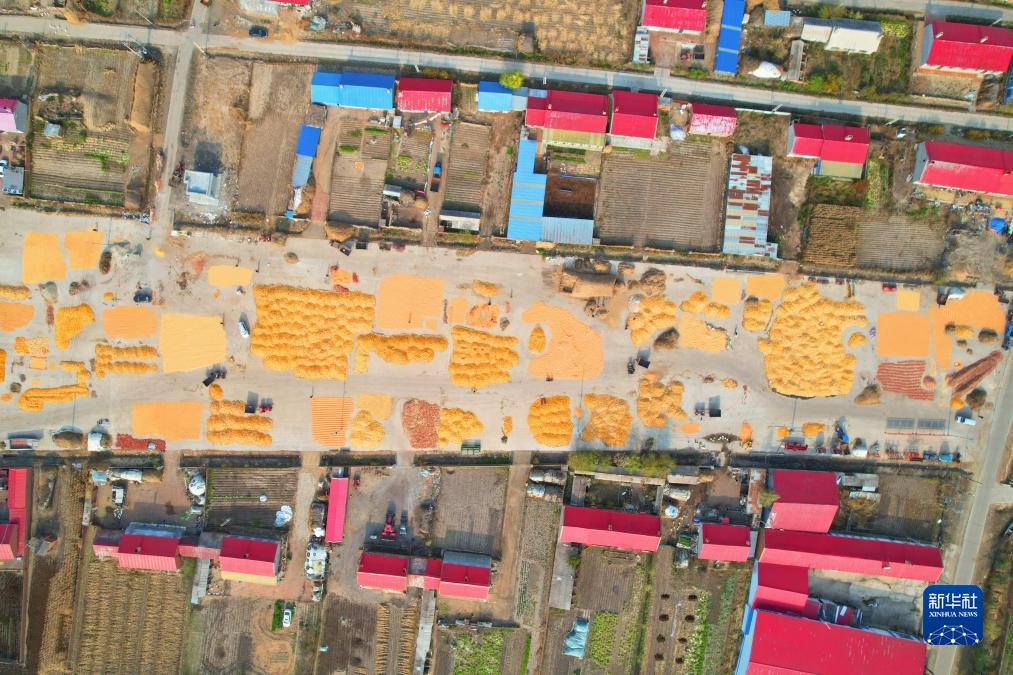 10月24日,在黑龍江省富錦市大榆樹(shù)鎮邵店村,農民把收獲的糧食運到空地上晾曬(無(wú)人機照片)。