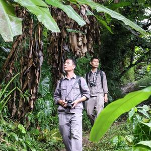 凌晨5點(diǎn),海南長(cháng)臂猿監測隊隊員李文永已在晨光泛起前抵達長(cháng)臂猿?;顒?dòng)的區域。根據猿鳴定位尋蹤,統計海南長(cháng)臂猿種群個(gè)數,拍攝照片和視頻,這些都是他的工作內容?!坝袝r(shí)為監測需要,背著(zhù)幾十斤重的生活物資和裝備,在山上吃住也是常事。海南長(cháng)臂猿的‘歌聲’,誰(shuí)聽(tīng)了都喜歡,很想一直能聽(tīng)到它們的聲音”,李文永說(shuō)。