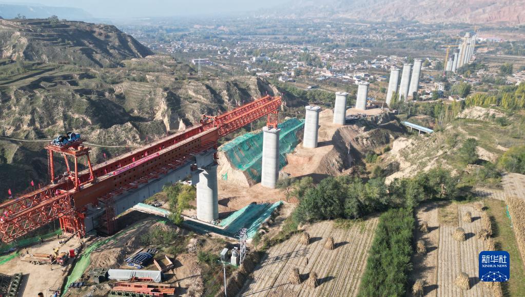 10月24日拍攝的位于甘肅臨夏境內的蘭合鐵路4標段泄湖峽大夏河特大橋膠拼梁架設施工現場(chǎng)(無(wú)人機照片)。