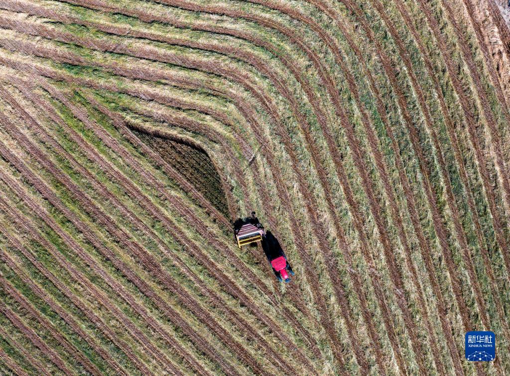 10月24日,村民駕駛農機在拉薩市林周縣強嘎鄉曲嘎強村收割牧草(無(wú)人機照片)。