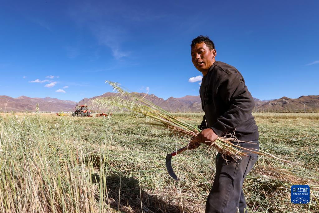 10月24日,拉薩市林周縣強嘎鄉曲嘎強村村民阿旺旦增在自家田壟邊收割牧草。