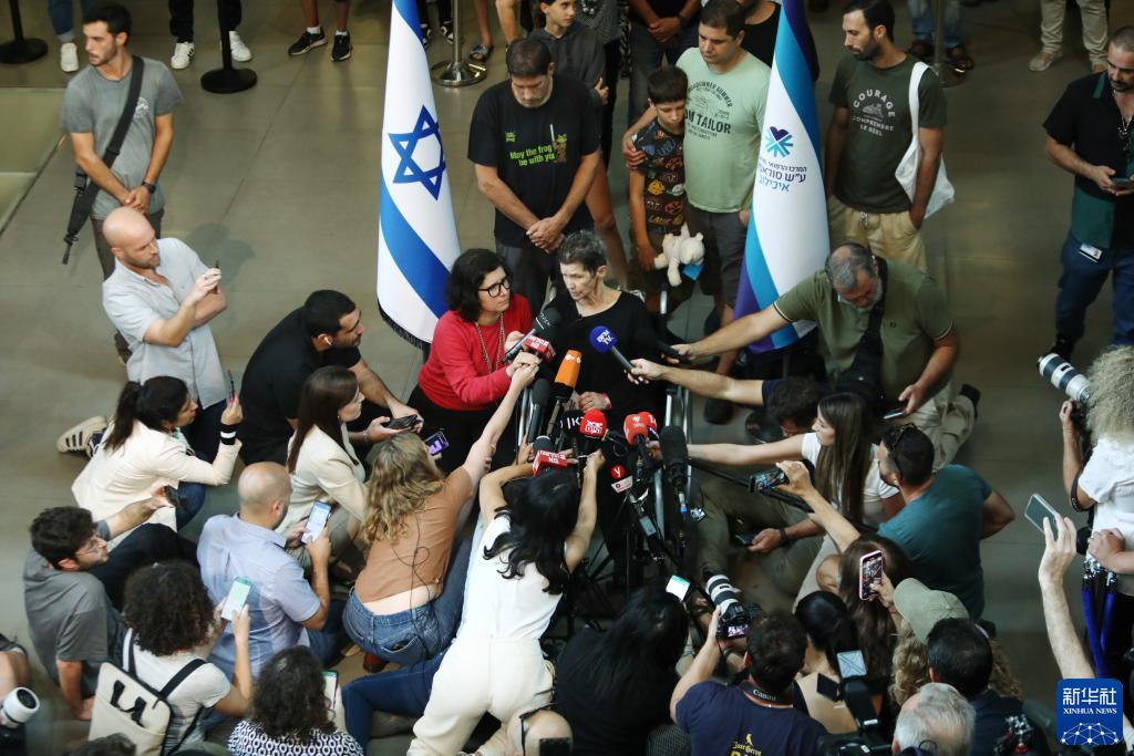 10月24日,獲釋的以色列被扣押人員約赫韋德· 利夫希茨(中)在以色列特拉維夫接受采訪(fǎng)。