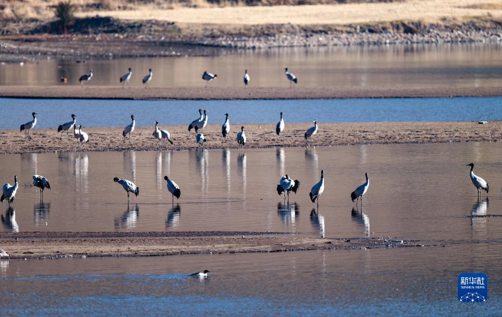 這是在拉薩市林周縣虎頭山水庫拍攝的越冬黑頸鶴(10月24日攝)。