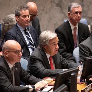 10月24日,在位于紐約的聯(lián)合國總部,聯(lián)合國秘書(shū)長(cháng)古特雷斯(前中)在安理會(huì )巴以局勢高級別會(huì )議上講話(huà)。