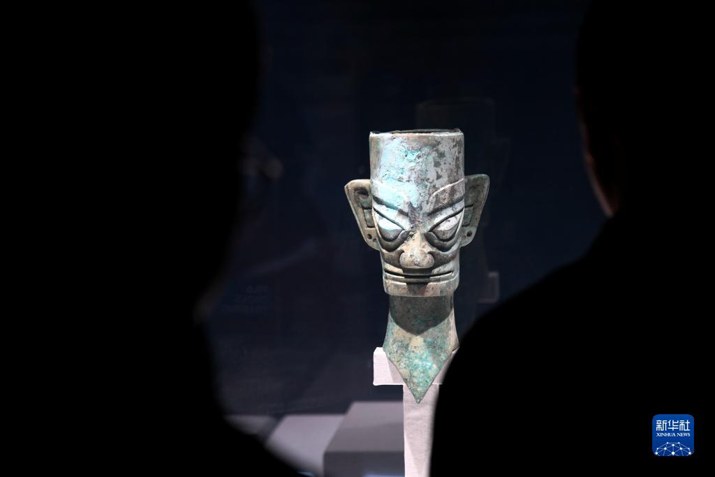 10月25日,觀(guān)眾在秦始皇帝陵博物院觀(guān)看四川省文物考古研究院館藏文物銅人頭像。