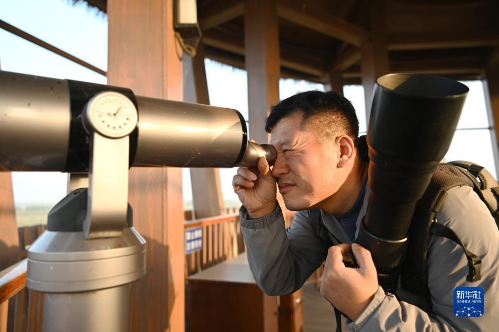 10月24日,韓戰橋在雄安新區孝義河河口濕地瞭望塔上用望遠鏡觀(guān)測野生鳥(niǎo)類(lèi)。