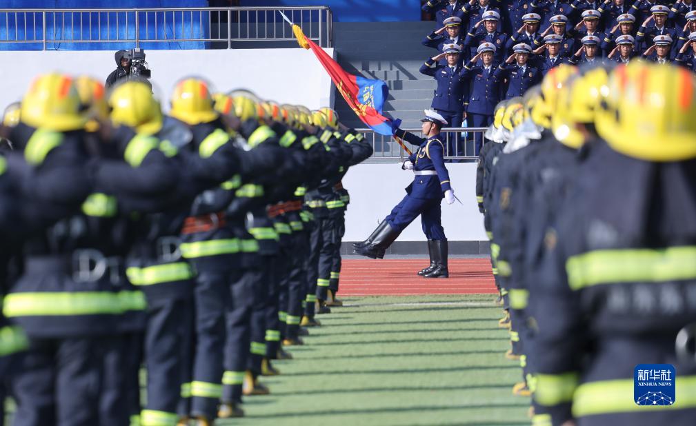10月25日,消防員在閉幕式上向中國消防救援隊隊旗敬禮。
