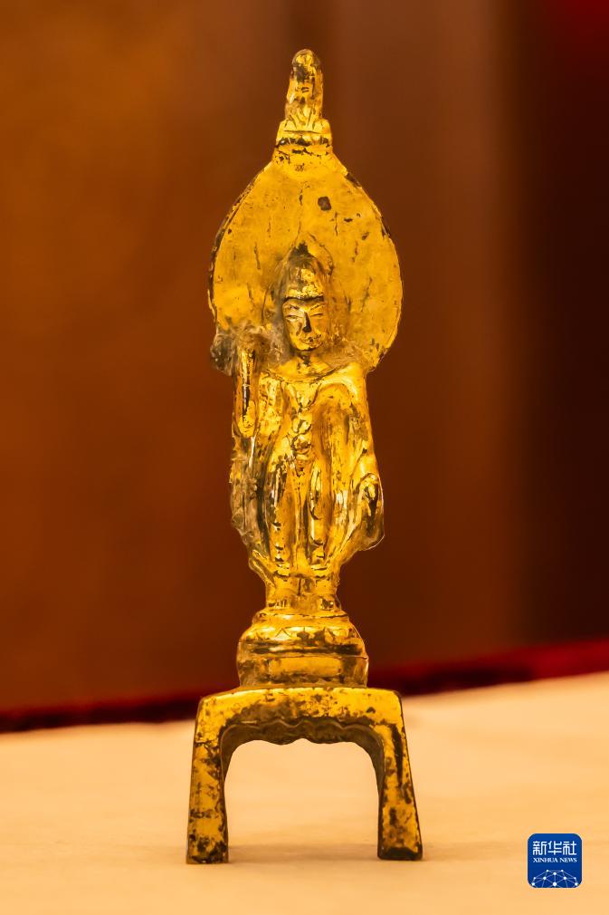 10月25日,在澳大利亞首都堪培拉,中國駐澳大利亞大使館展示澳返還的隋晚期至唐銅鎏金佛立像。
