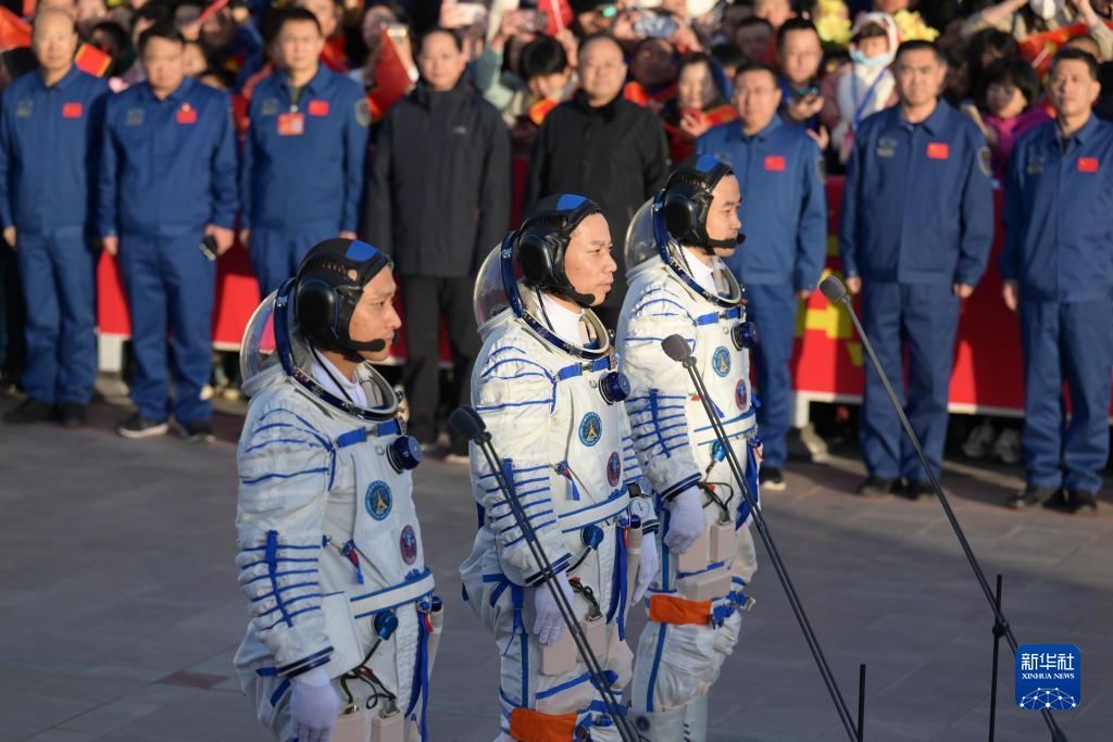 10月26日上午,神舟十七號載人飛行任務(wù)航天員乘組出征儀式在酒泉衛星發(fā)射中心問(wèn)天閣圓夢(mèng)園廣場(chǎng)舉行。這是航天員湯洪波(中)、唐勝杰(右)、江新林在出征儀式上。