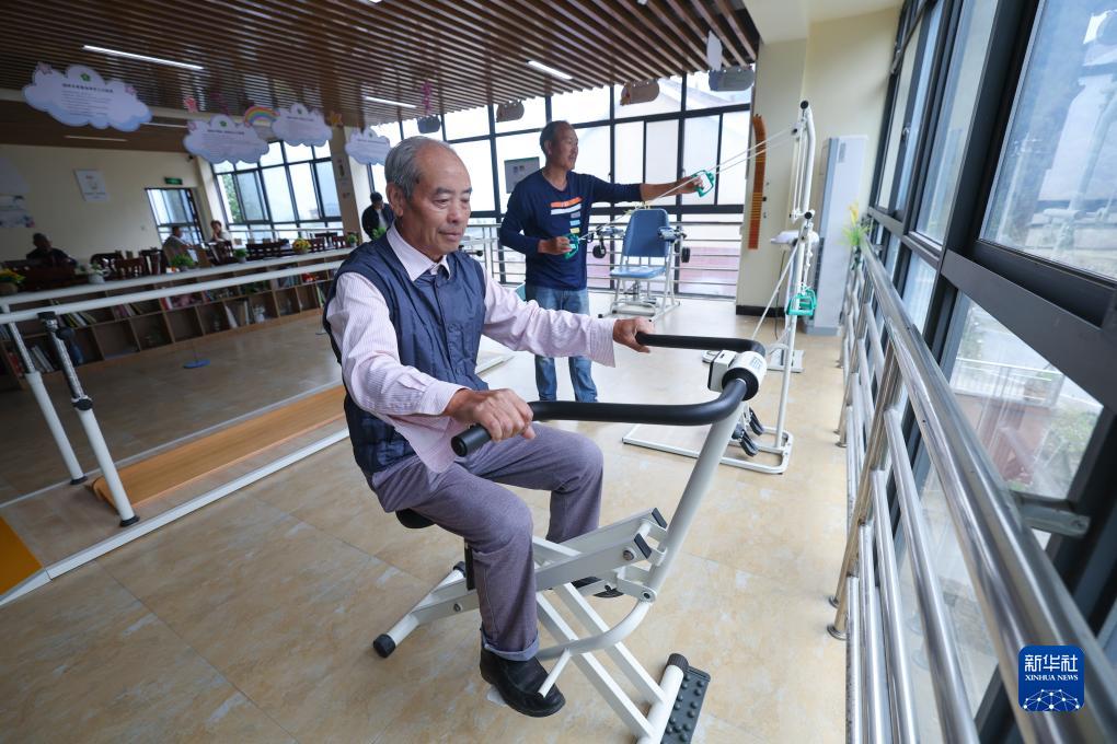 10月26日,在杭州市富陽(yáng)區湖源鄉居家養老服務(wù)中心,老人們使用健身器材鍛煉身體。