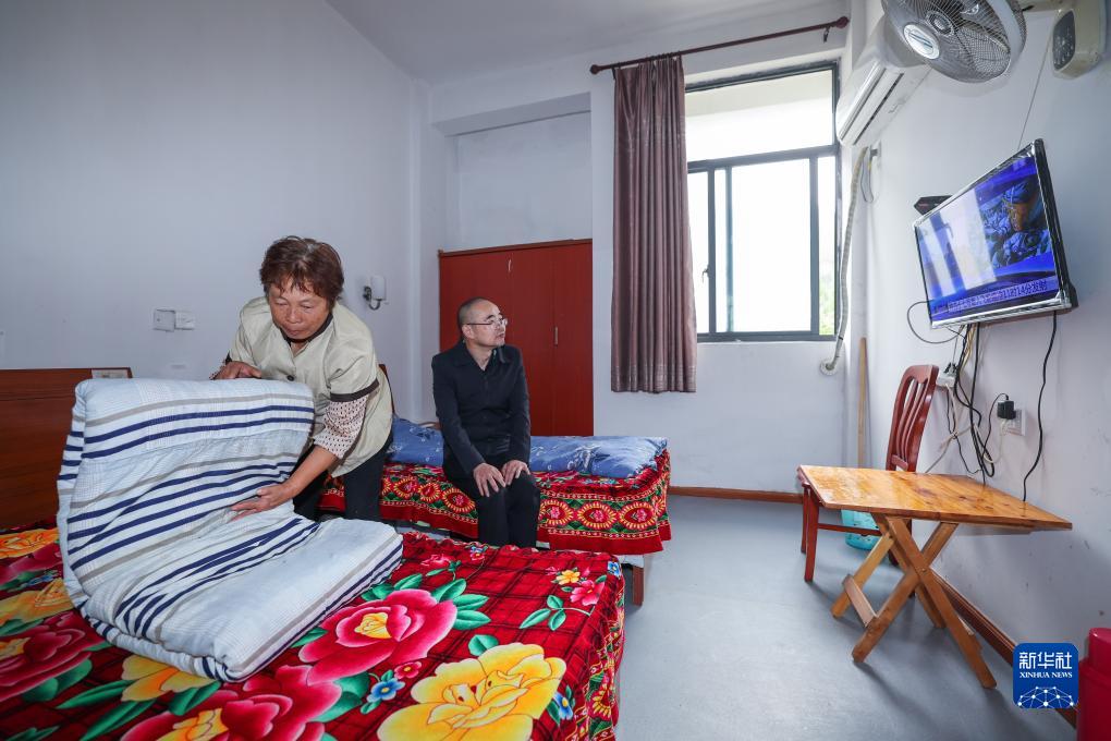10月26日,工作人員在杭州市富陽(yáng)區湖源鄉居家養老服務(wù)中心為老年人整理床鋪。