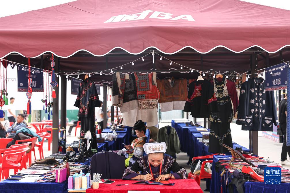 10月25日,當地群眾在臺江縣球場(chǎng)旁搭建的非遺集市上制作刺繡。