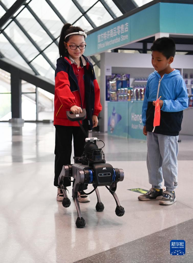 10月26日,觀(guān)眾在杭州拱墅運河體育公園體育場(chǎng)大廳體驗電子導盲犬“小西”。