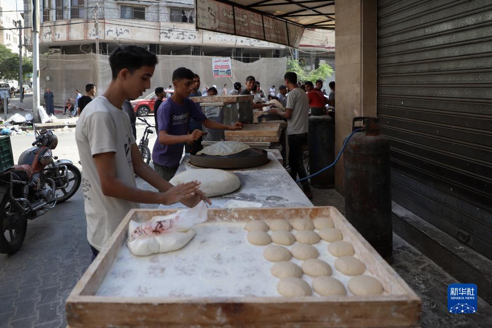 10月25日,在加沙地帶南部城市汗尤尼斯,烘焙店工作人員在制作食品。