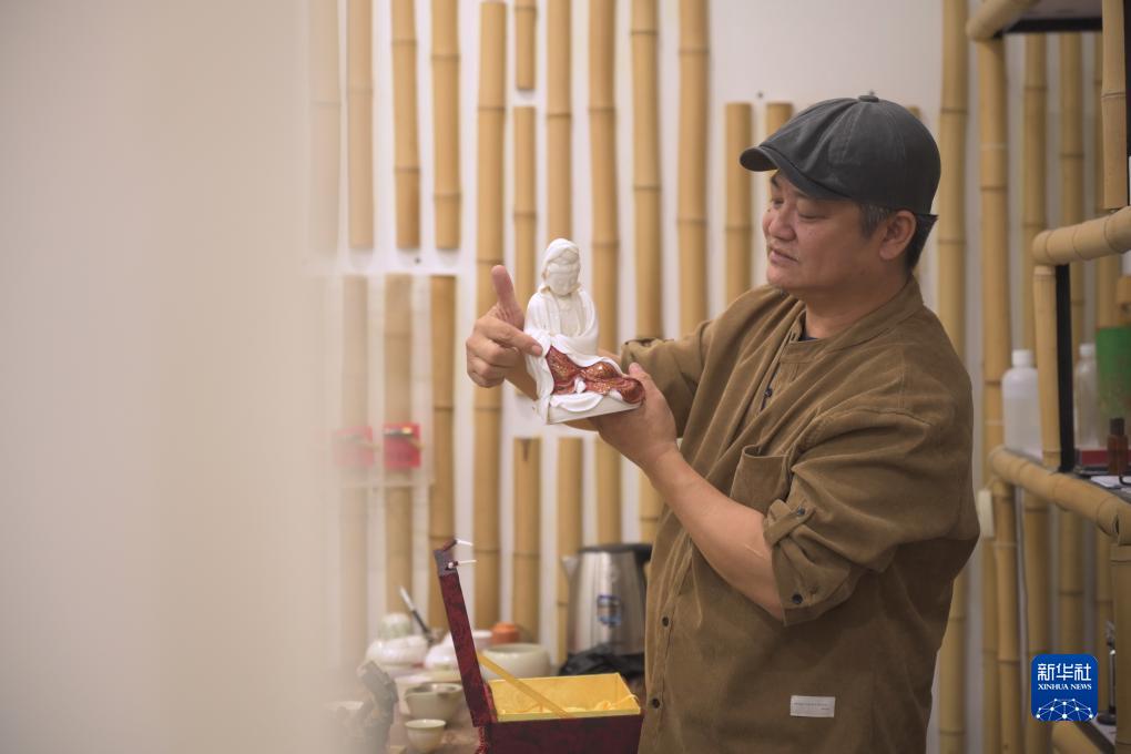 10月25日,黃守堃在介紹臺灣漆藝技法應用在德化白瓷上的創(chuàng )新實(shí)例。