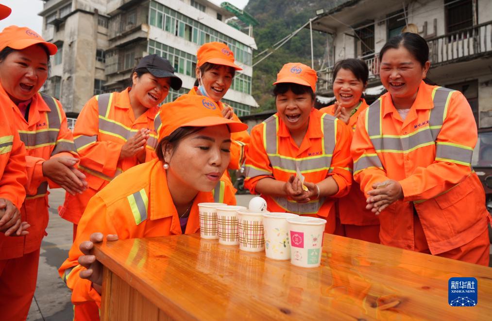 10月26日,廣西柳州市融水苗族自治縣的環(huán)衛工人參加吹乒乓球比賽。