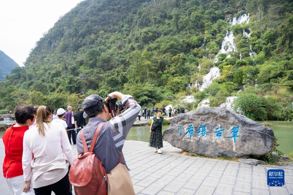 10月26日,游客在貴州省荔波縣小七孔景區內拍照留念。