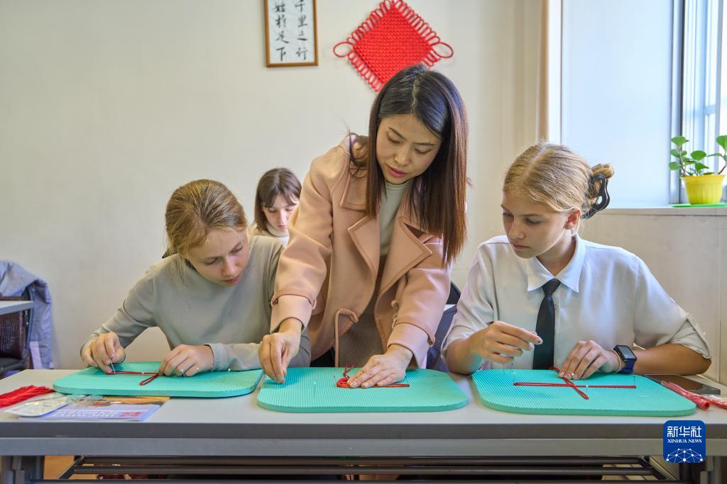 10月26日,在俄羅斯符拉迪沃斯托克的遠東聯(lián)邦大學(xué)孔子學(xué)院,來(lái)自吉林省的手工藝人徐曉雪(中)教學(xué)生制作中國結。