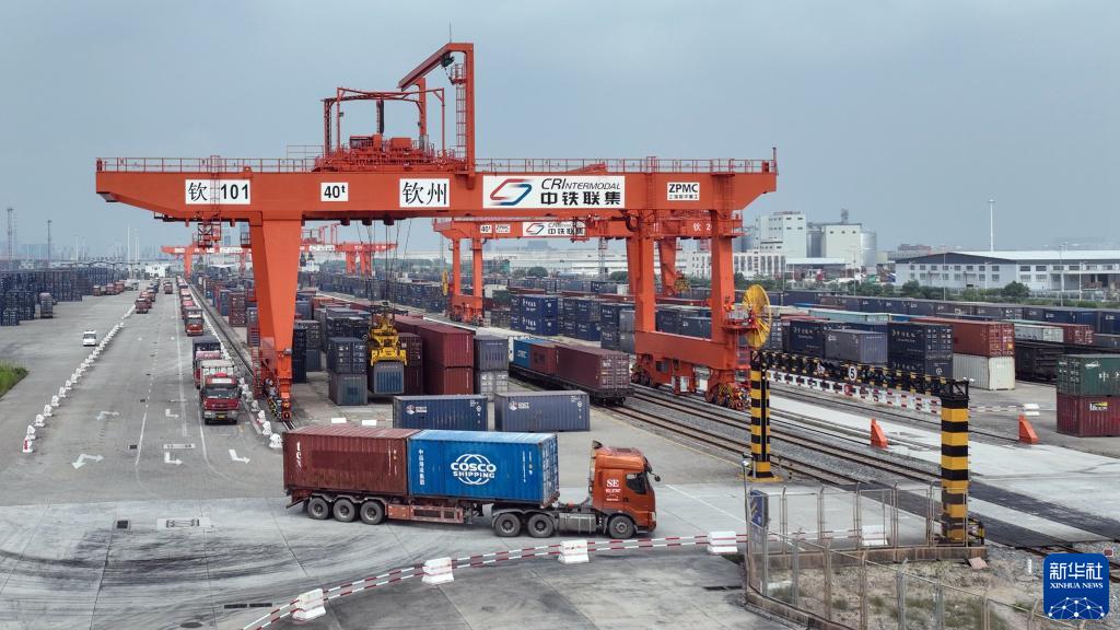10月26日,在欽州鐵路集裝箱中心站貨場(chǎng),火車(chē)和汽車(chē)正在轉運集裝箱(無(wú)人機照片)。
