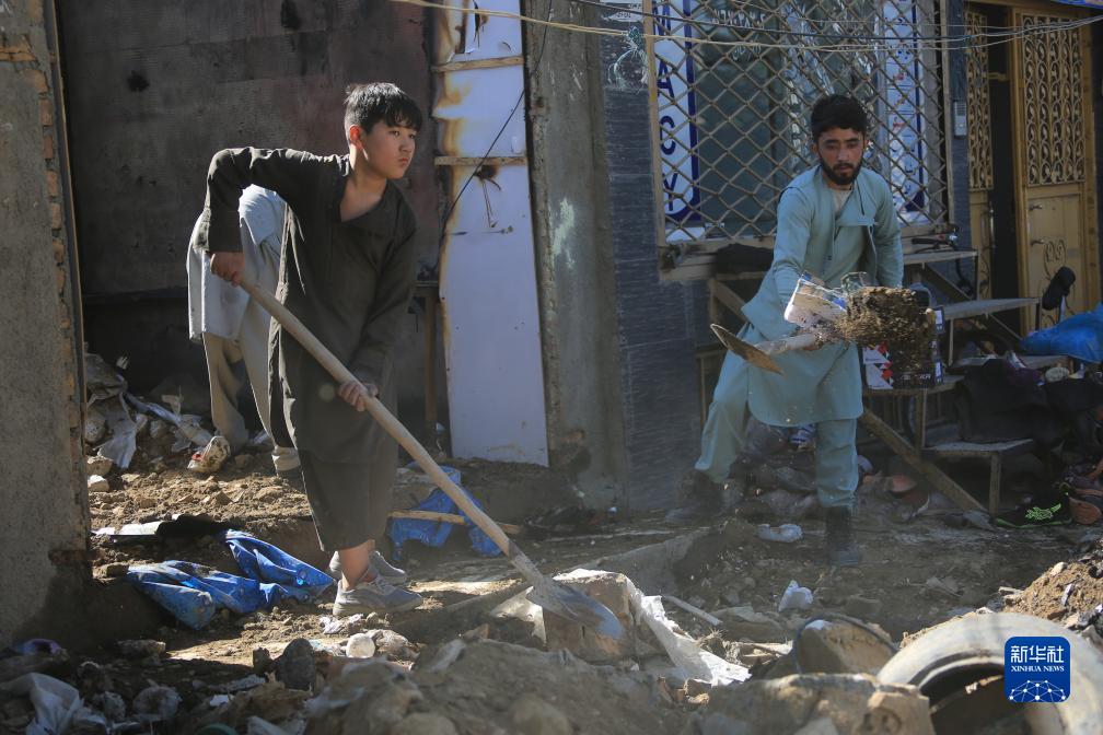 10月27日,在阿富汗首都喀布爾,人們在爆炸事件后清理磚瓦。