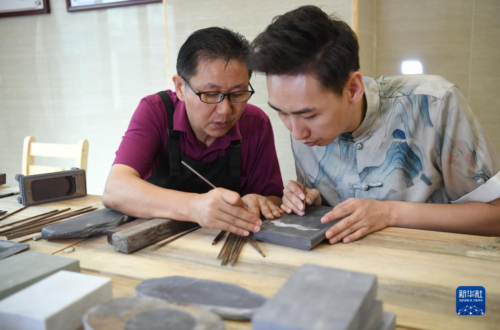 10月26日,在廣東肇慶柳新祥端硯藝術(shù)館的工作室,柳新祥(左)和兒子柳飛探討端硯制作技藝。