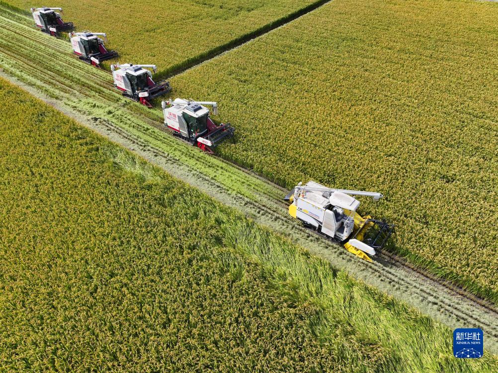10月27日,無(wú)人駕駛機械(前)和有人駕駛機械在江蘇省南通市通州區十總鎮育民村高標準農田收割水稻(無(wú)人機照片)。